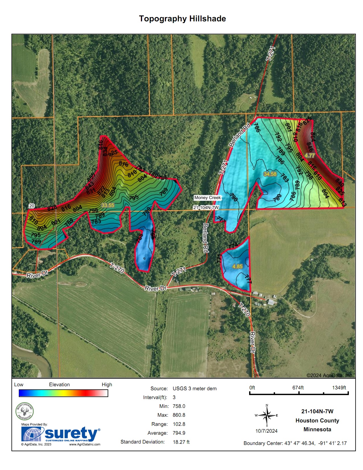 This gently rolling 175-acre picturesque legacy farm has south facing panoramic views of the expansive Rushford Root River valley. The land sits 5 minutes east of Rushford within Money Creek Township just into Houston County, hunts big and has a great mixture of good hardwood timber, springs, creek, CRP, and tillable revenue! There are many points of access which all allow for undetected entry to excellent stand locations. Deer and turkey sign are abundant throughout this land. The Northwest 30-acre field is in CRP-Safe (which allows up to 10% in food plot) and produces $7,263 in annual income through 9.30.2032. The gently sloped south facing field has many inside corners which can be hunted in multiple wind directions, is filled with tall native grasses, wildflowers, and clover which provide great cover and food for deer, turkey, and pheasants. There are several apple trees around the field edges. The south side of the CRP field wood edge has several acres of flat elevated south facing land which would be a very nice place to build your home or cabin. This location holds panoramic south facing views of the Root River valley. A year-round creek runs east of the CRP field through the middle of the property which ensures year-round water for wildlife. The northeast part of the farm has multiple wooded plots and a 40-acre field. The winding tree line provides many inside corners and draws to hunt along with access to 326acres of land locked timber state land on the Northeast corner. The 40-acre field generates approximately $9,200 in tillable annual revenue. Additional adjacent tillable land and land with Root River and bike trail available. 20 miles to Winona, 25 miles to Lacrosse, and 45 miles to Rochester.