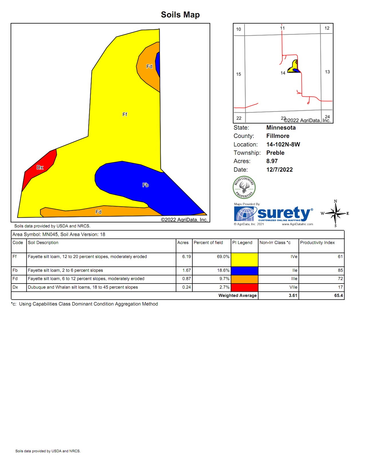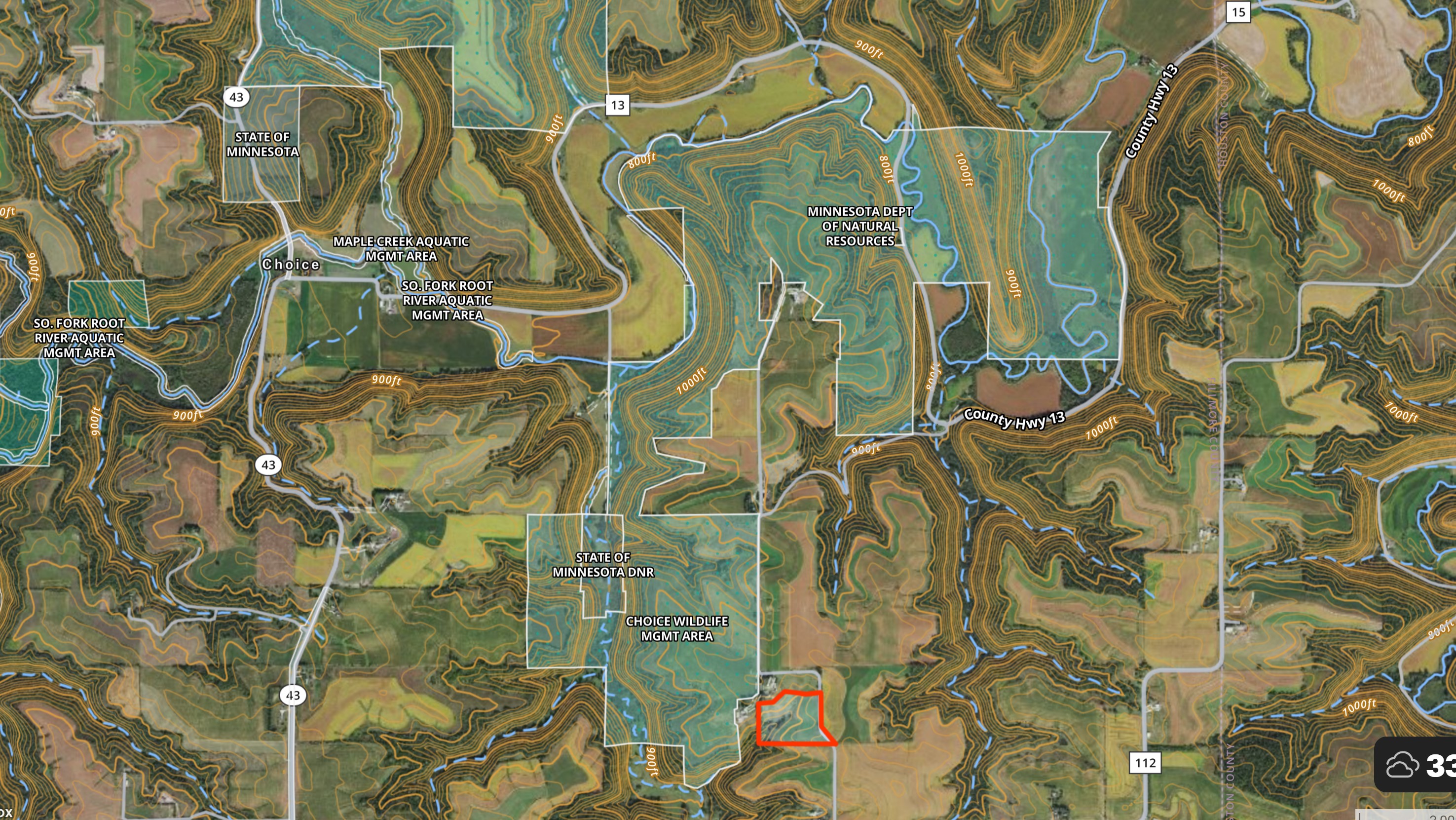 Here is a wonderful opportunity to build your new home or cabin on this top access bluff country land which is next to over 1000 + acres of Choice Wildlife Management area. There are multiple top access entry points into the Choice WMA within ½ mile. This expansive WMA land has creeks and established CRP which provides great cover for deer, pheasants, and turkey. Lots of trails and towering, big timber to explore and hunt. This land includes 9 rolling tillable acres with flat access off the township road. Fiber optic cable runs along the road. The highest point has a sizable flat area for building with a wonderful panoramic view of the valley to the south and west. The sunrise and sunsets are amazing on top of this perch. There are 10.39 acres of pasture with oaks and walnuts. The land is partially fenced. Walk out your back door and hunt and trout fish some of the best terrain southeastern Minnesota has to offer. The expansive Choice Valley is 1.5 miles to the north with the South Fork Root River flowing through it. This stretch of the river is great for fly fishing!