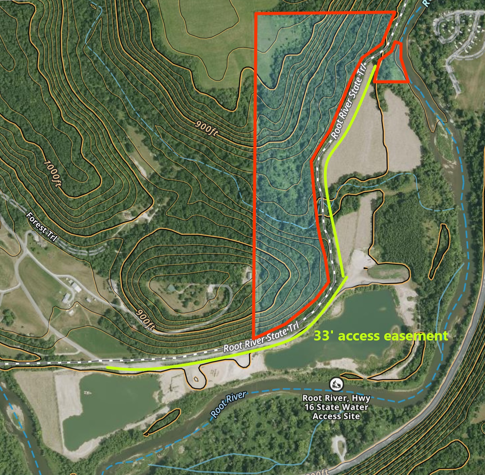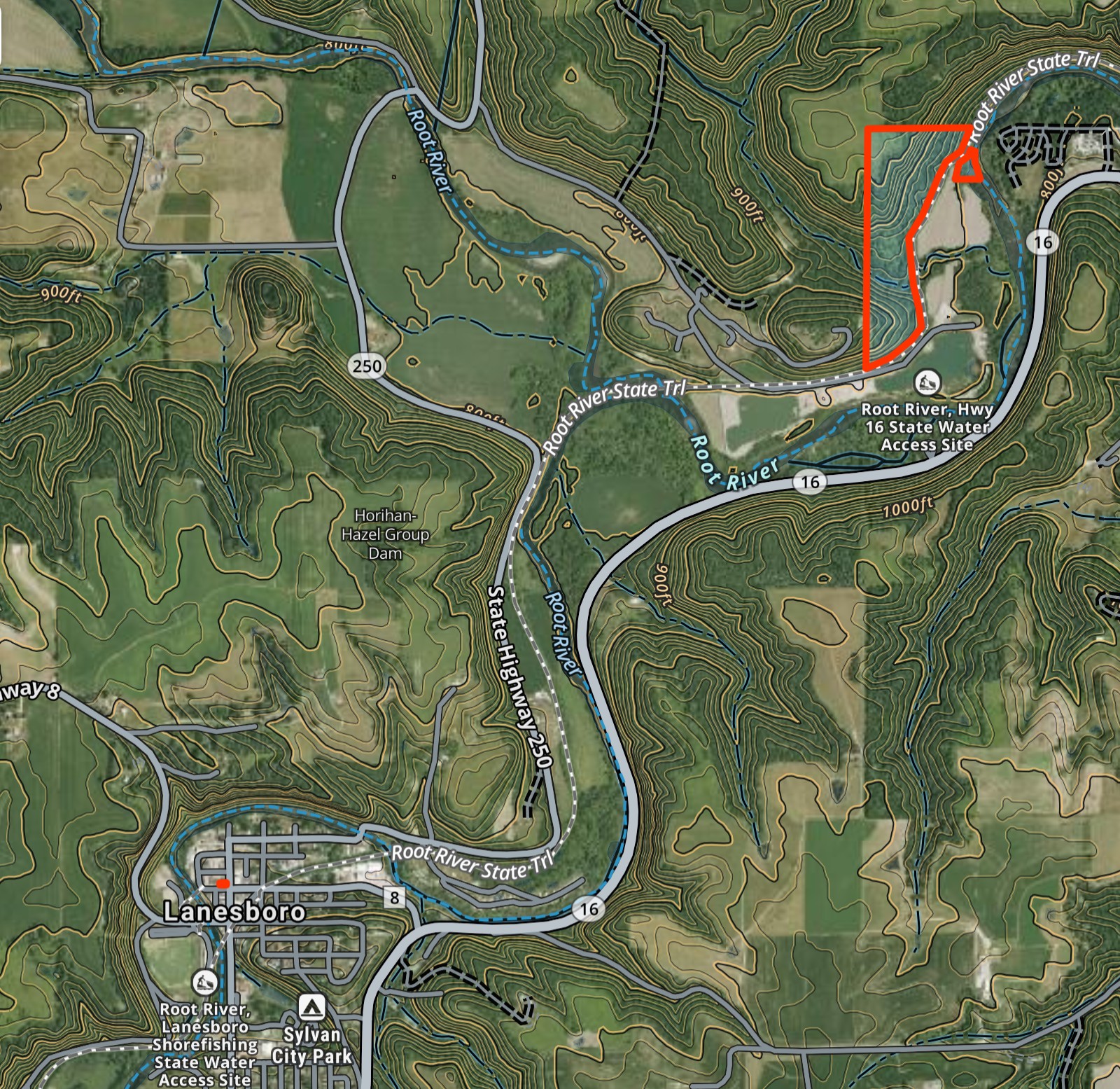 The ¾ mile easement access has an established road which leads to this secluded 40 acres of buildable land on the Root River just outside of Lanesboro. The Root River bike trail runs along the perimeter of the property and is a short ride into the city of Lanesboro. The property has a nice mixture of hardwoods, black walnut and south facing cedars which provide nice winter thermal cover for the deer and turkeys. There is a mixture of high ground overlooking the bluffs, low ground on the river and a couple of natural clearings which would be great spots for food plots or setting up camp. There is electric at the edge of the property. Enjoy about 2 acres right along the Root River and enjoy the serenity the bluff country provides.