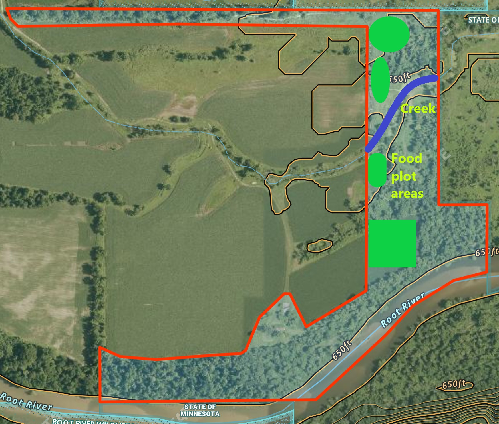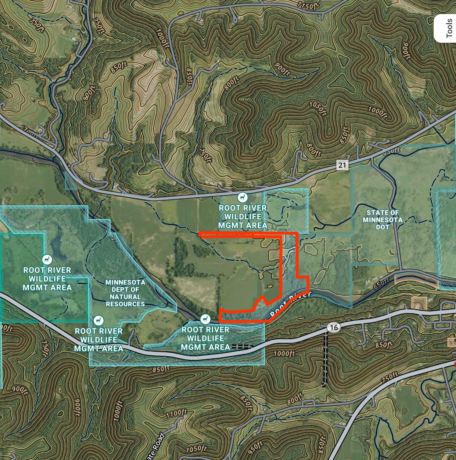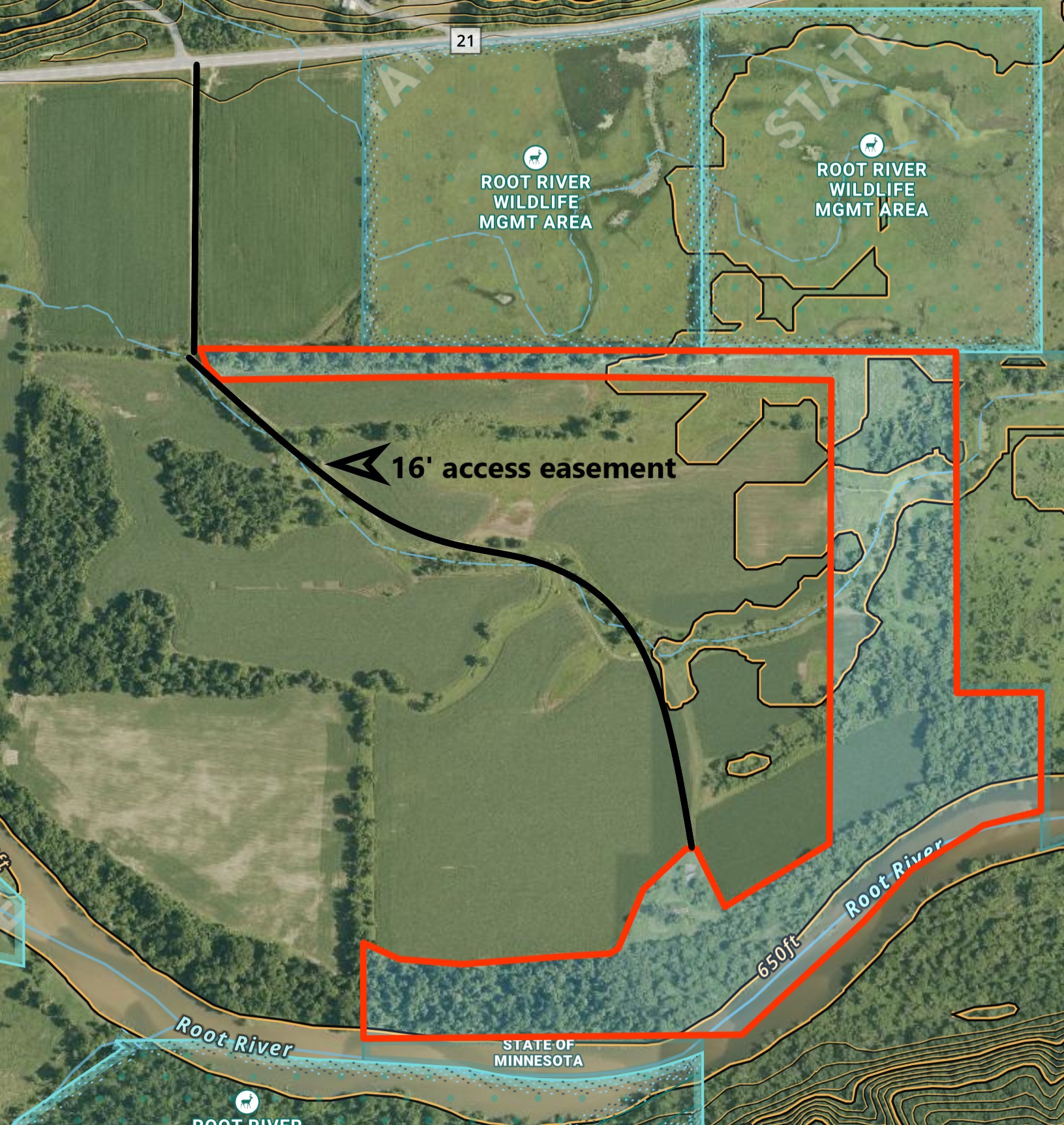 A ¼ easement driveway off paved County 21 leads to this secluded hunting and recreational property. The land sits on ½ mile of the Root River surrounded by towering bluffs outside Hokah within Houston County, MN. There are 5 acres in secluded areas to put in food plots. One of the fields is 3 acres and could be rented back to the farmer for income. The 46 acres of woods are intermixed around the tillable fields and offer many opportunities to deer hunt on all wind directions. The deer, duck, and turkey populations are plentiful. There’s a duck slough which meanders through the property and is teaming with wildlife including ducks, otters, beavers and more! There is an established trail which leads to a cleared camping area on the Root River. An old open storage shed is present and allows you to store a few things. There’s a small spring fed pond next to the shed. A 16’ easement runs along an established field road through the main farm to give you direct access to the Root River and shed. A short commute to La Crosse and La Crescent.