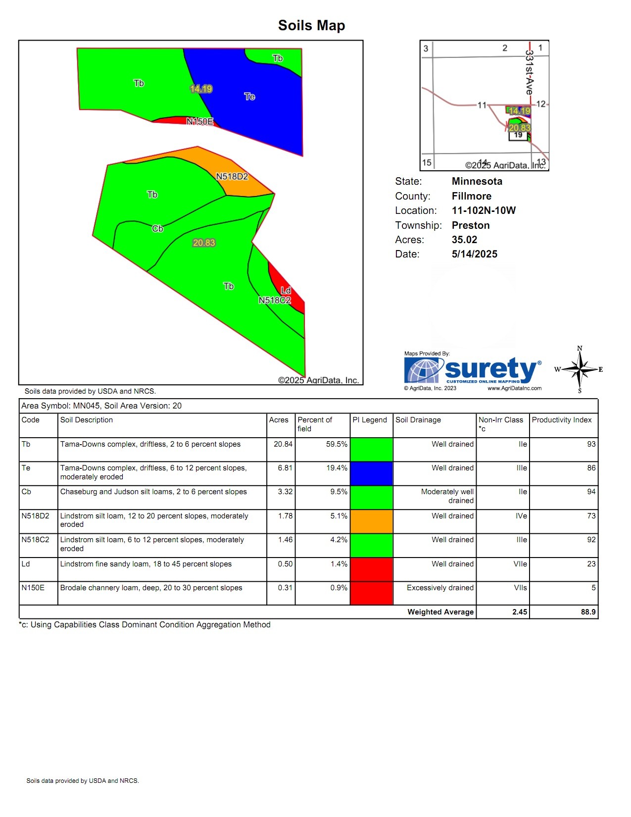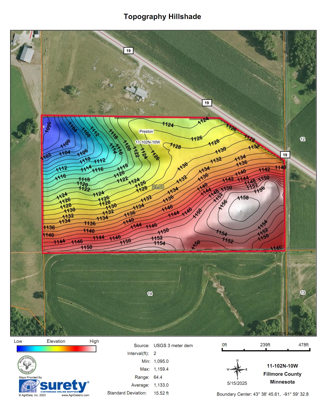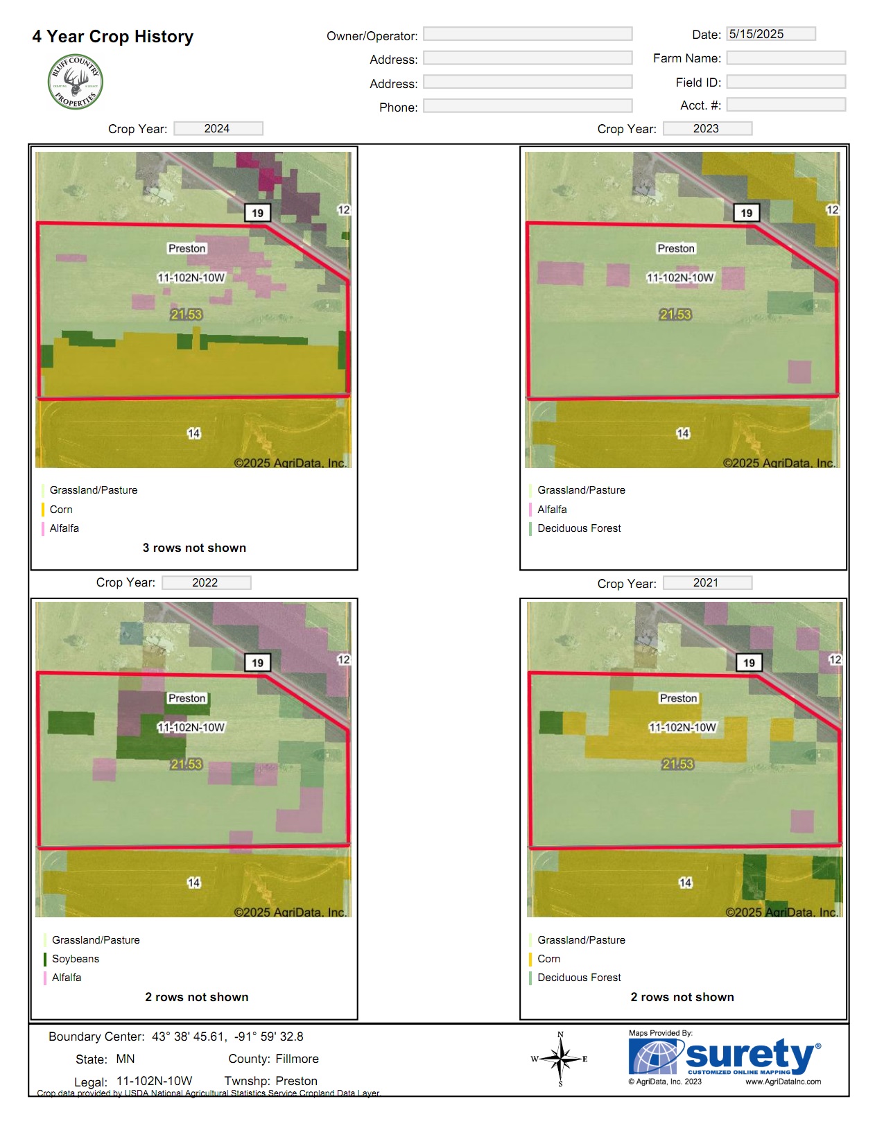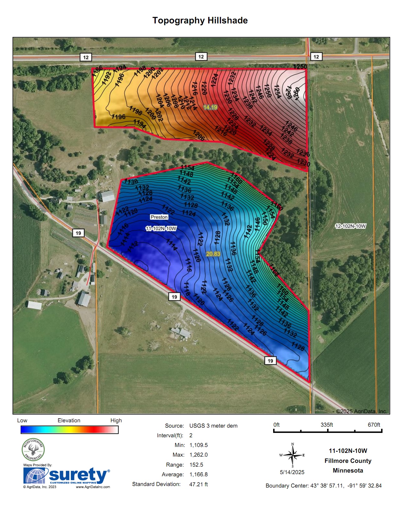This 68-acre tract has 80% Tama-Downs soils with established County 19 and County 12 road access points for farming. There are approximately 57 acres of tillable and 11 acres of pasture. Some light tree removal could open more tillable acres. It sits in an open quarter and is buildable. The south facing panoramic views from the top field off paved CTY 12 are amazing and would be an incredible building site. This property would make a good 1031 exchange or farming operation expansion. It’s available to plant now. 4 miles east of Preston, 6 miles north of Harmony, 4 miles south of Lanesboro, and 6 miles west of Highland. TBD CTY 19/CTY 12 Lanesboro, MN.