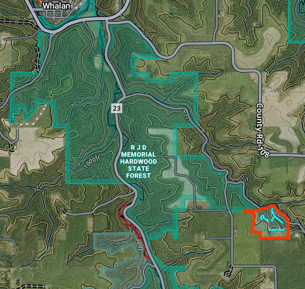 This secluded buildable hunting land property near Lanesboro has many attractive attributes. The ¼ mile flat top access easement runs through a large farm along a mature CRP field and leads to an amazing building site area and the first of many prime areas for food plots and ponds. There are 11 acres of CRP on top with many inside corners which provide great deer bedding, pheasant cover, and income. The tillable is hidden from the road where the deer and turkey can enter without hesitation. There are multiple small areas off the field edges with natural openings which are staging areas and places to put plots and ponds. There are mature black walnuts, oaks, and hardwood trees on this gentle rolling tract. There are established trails which meander throughout the wooded areas which create easy access to stand locations which you can hunt on multiple wind directions. The land sits high at the top of a long valley which consists of 1700 acres of state land which hosts the Gribben creek trout stream and leads down to the Root River. There is bottom access off Dakota Rd with established trails for great morning stand access. The bike trail is close by in Whalen. The deer numbers, deer sign and genetics in this area are incredible. Don’t miss your chance to own this 48-acre slammer property in the Bluff Country!