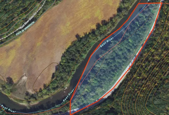 51 acres of secluded hunting land with ½ mile of Root River and duck slough near La Crescent within Houston County, MN